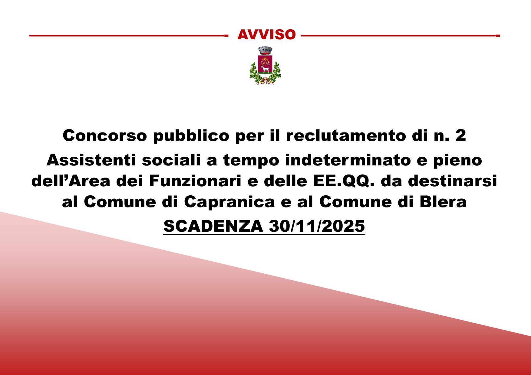 Bando di concorso per n. 2 assistenti sociali a tempo indeterminato e pieno da destinare ai Comuni di Capranica e Blera
